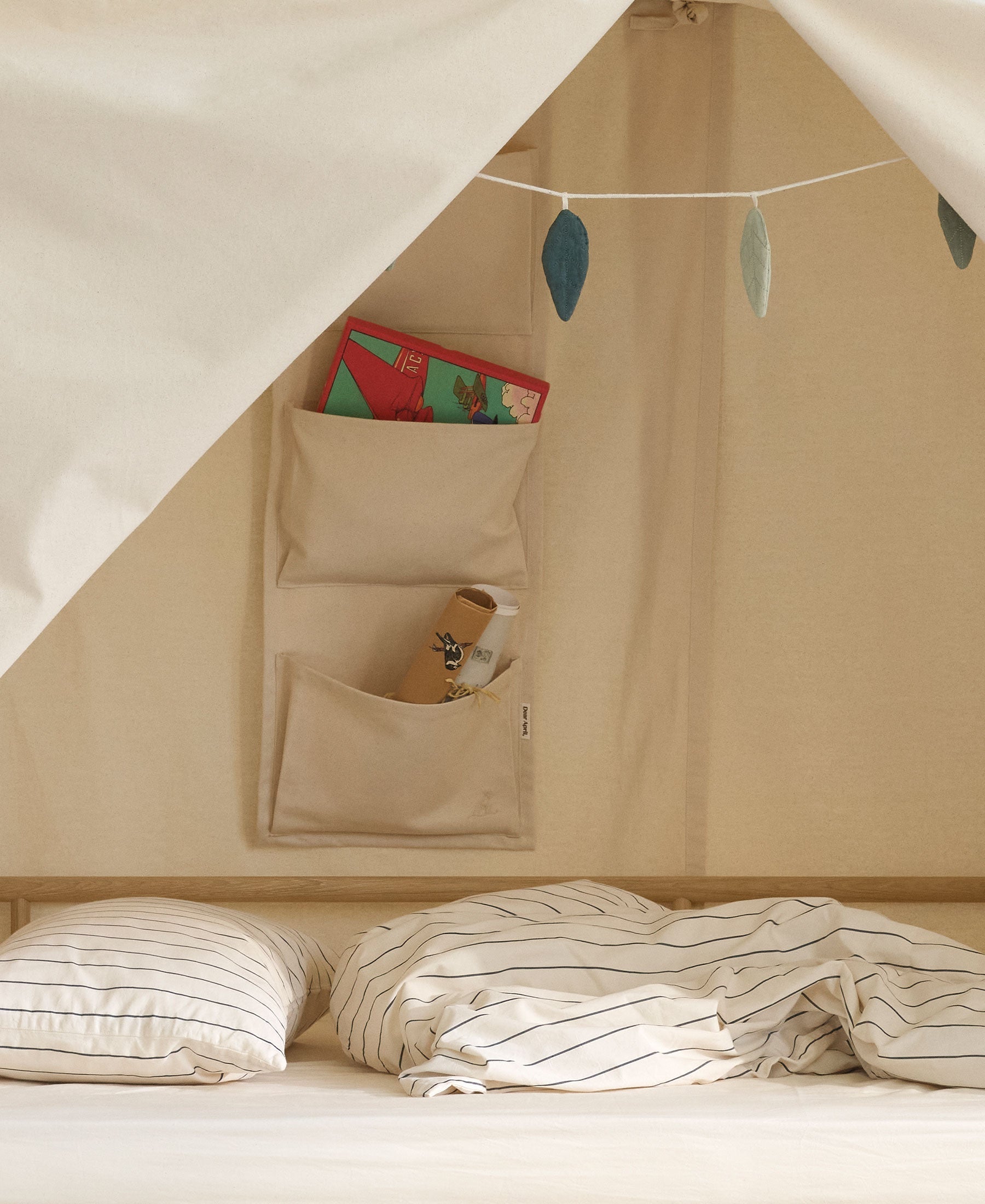 Organiseur suspendu en toile épaisse non teinte, dont le naturel se manifeste par les petits picots délicats issus des coques du cotonnier. Ce tissu non teint permet d'éviter l'utilisation de nombreux produits chimiques inutiles, tels que les agents de blanchiment et les teintures. Nous le trouvons moins beau qu'ici, dans sa couleur pure et naturelle. Cet organiseur suspendu est décoratif et pratique pour ranger tout, de votre ours en peluche préféré à vos livres. Il se fixe facilement au lit ou au mur grâce à de fines attaches ou à l'une des boucles cousues.